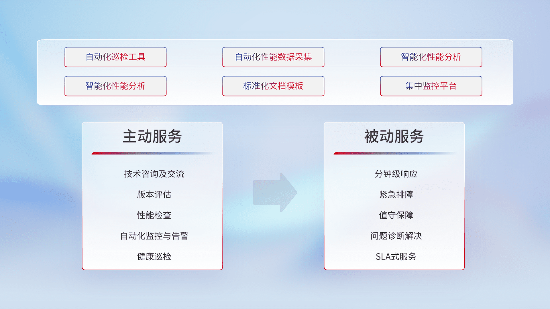 智能化工具和标准化文档,,,保障服务质量,,提供主动服务(包含技术咨询、、版本评估、、性能检查、、自动化监控与告警、、健康巡检)和被动服务包含(分钟级响应、、紧急排障、、、、值守保障、、、、问题诊断解决、、、SLA服务)。。。